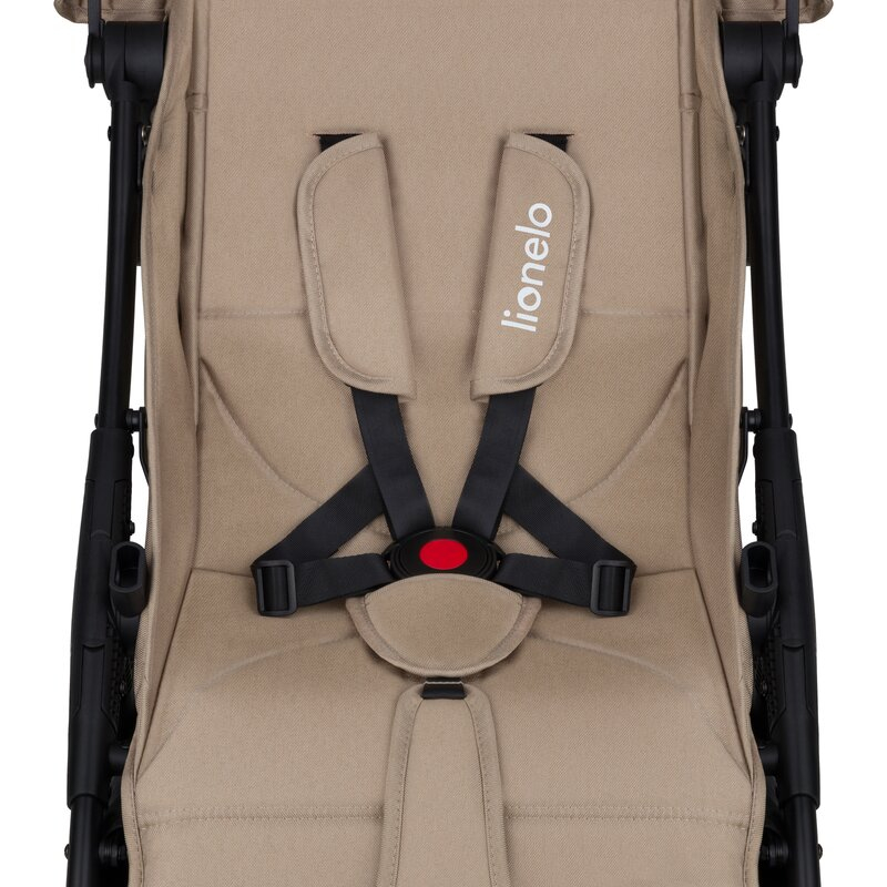 Caruciorul are centuri cu 5 puncte si pernute moi, care protejeaza pozitia copilului, fara a irita pielea delicata. Bariera de protectie poate fi complet indepartata sau inclinata pentru a introduce si scoate comod micul pasager. Caruciorul Lionelo Julie One a fost testat de un laborator independent SGS, cu rezultate pozitive. Confirmarea calitatii ridicate este conformitatea cu norma europeana de siguranta EN 1888.