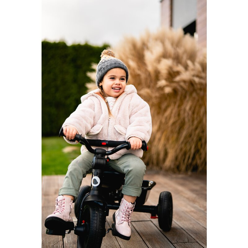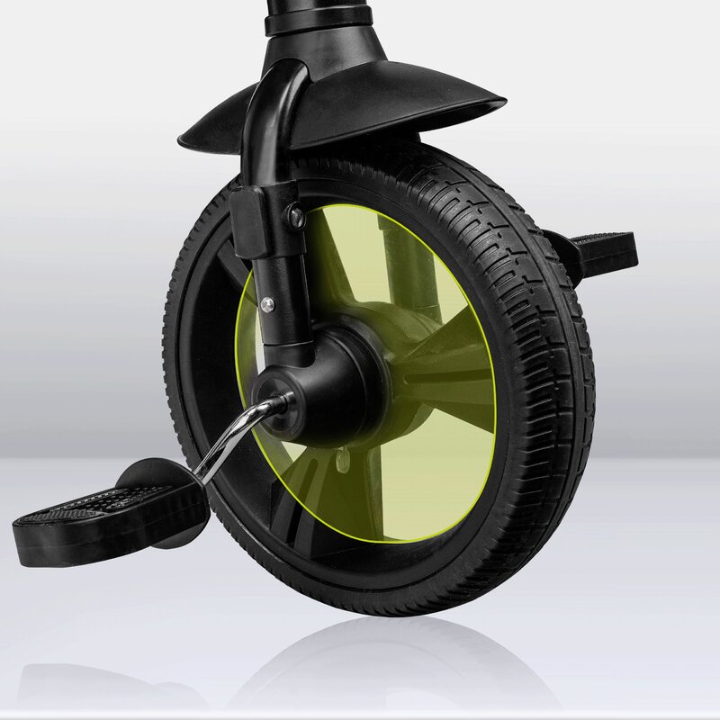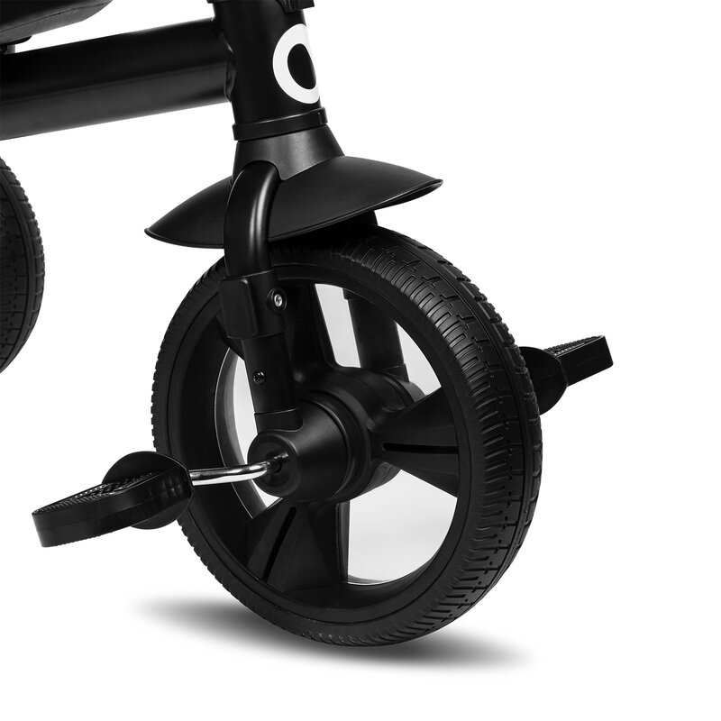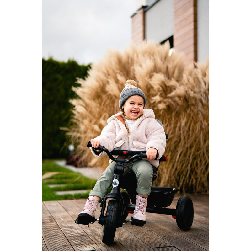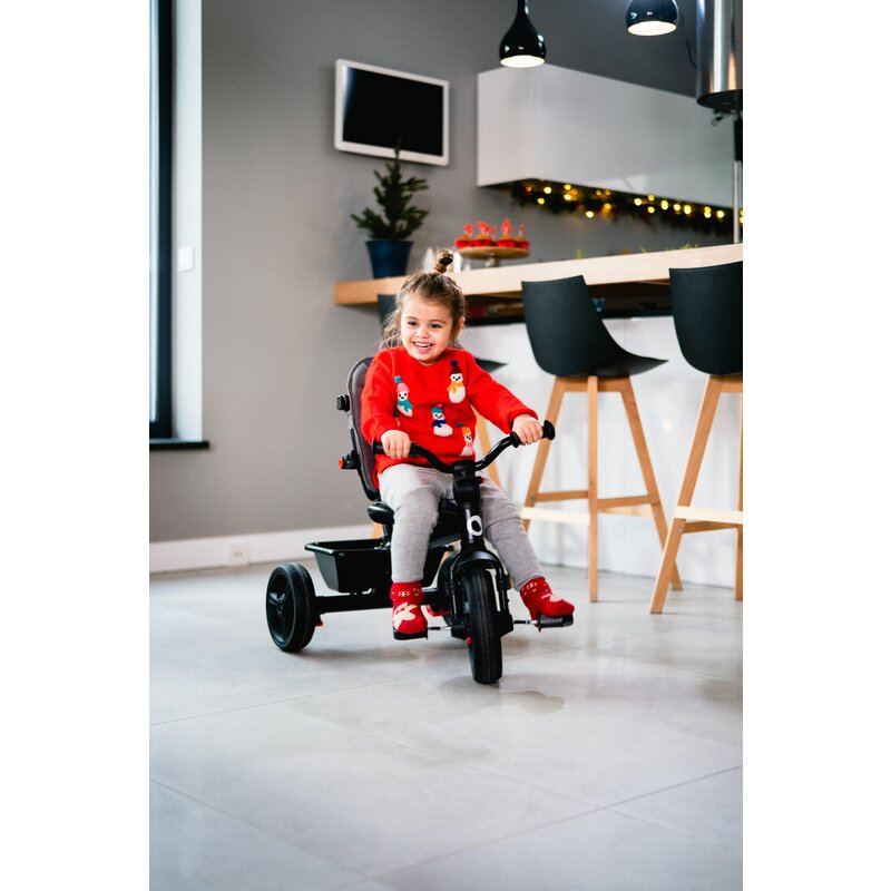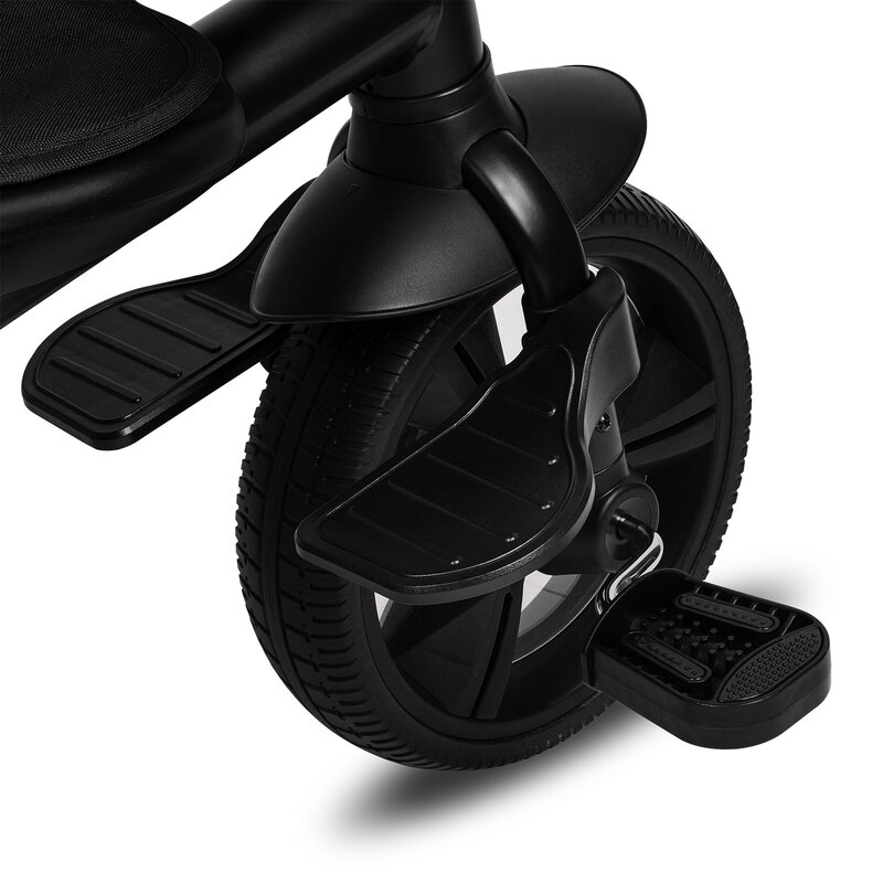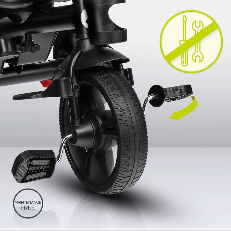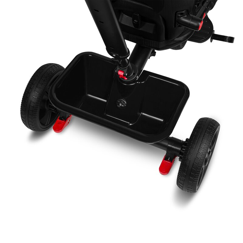 Tricicleta Haari 2 in 1 este echipata cu roti usoare cu banda de rulare, realizate din PU de inalta calitate. Capacul deasupra rotii din fata functioneaza ca un aparator de noroi si protejeaza picioarele copilului impotriva incurcarii. Produsul are un suport pentru picioare pentru copiii care inca nu pot ajunge la pedale. Utilizarea unei roti libere permite copilului sa pedaleze, dar parintele pastreaza controlul complet asupra directiei si vitezei de deplasare. Exista un ajutor suplimentar sub forma unui maner reglabil, a carui inaltime poate fi adaptata la inaltimea proprie.