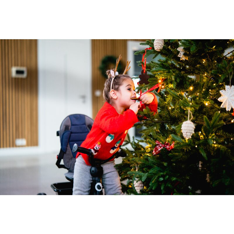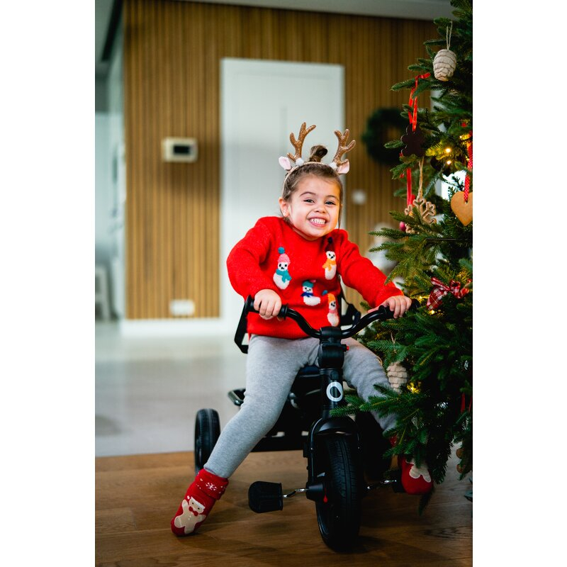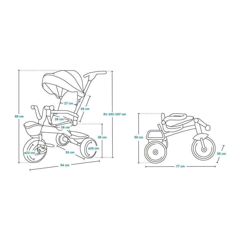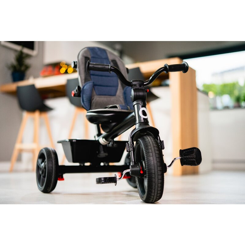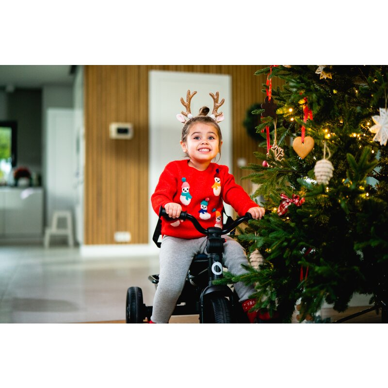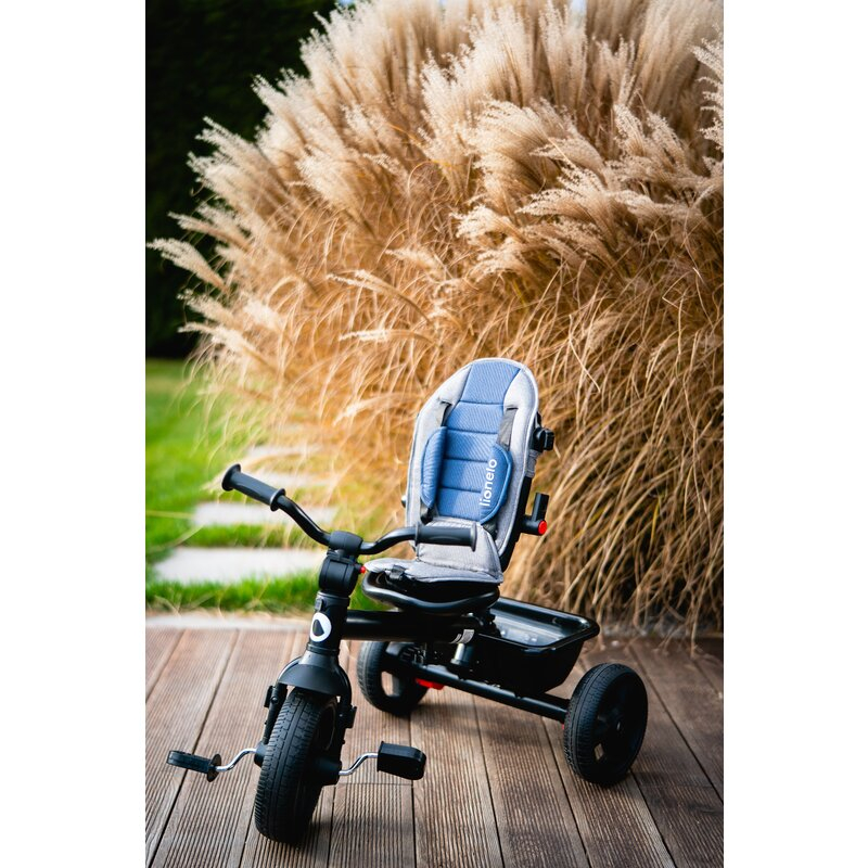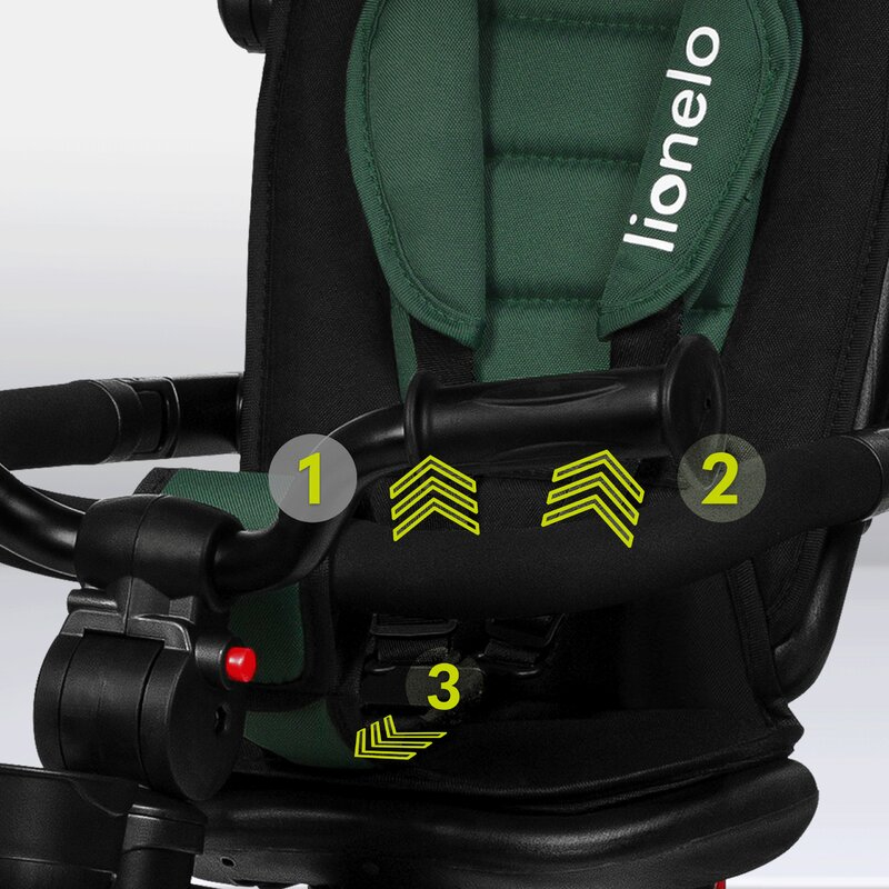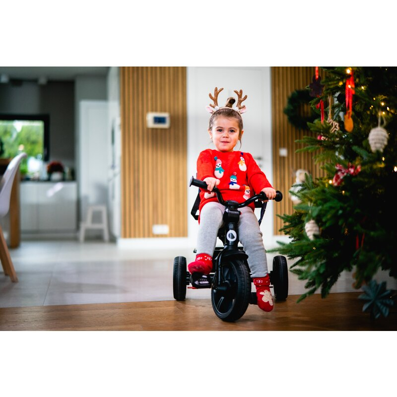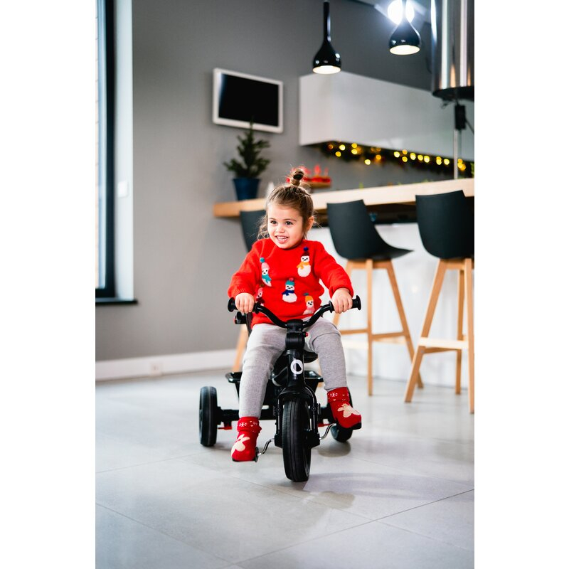 Tricicleta Haari 2 in 1 este echipata cu roti usoare cu banda de rulare, realizate din PU de inalta calitate. Capacul deasupra rotii din fata functioneaza ca un aparator de noroi si protejeaza picioarele copilului impotriva incurcarii. Produsul are un suport pentru picioare pentru copiii care inca nu pot ajunge la pedale. Utilizarea unei roti libere permite copilului sa pedaleze, dar parintele pastreaza controlul complet asupra directiei si vitezei de deplasare. Exista un ajutor suplimentar sub forma unui maner reglabil, a carui inaltime poate fi adaptata la inaltimea proprie.